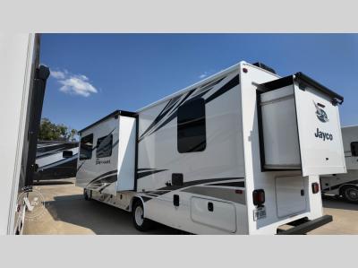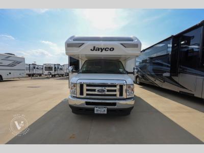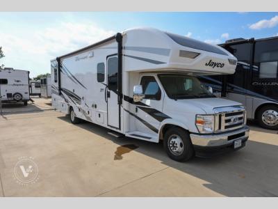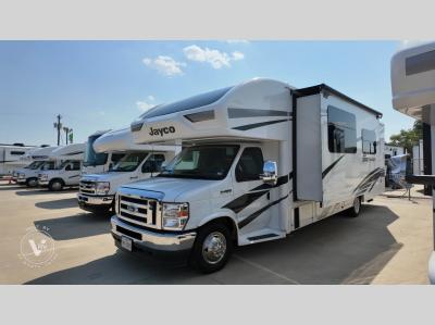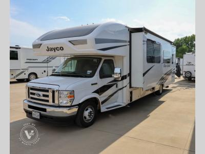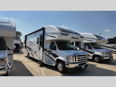 Pack your bags and head to your favorite camping spot in this spacious motorhome for six to seven. The little ones will love the cab-over bunk, and you'll have your own private bedroom in the back. There is also 72" theater seating and a 42" x 70" booth dinette that will serve as seating and sleeping space as well. This model will feel more like home with its fireplace, entertainment center with a 50" TV, and spacious living area. There is also a private toilet and shower, with the sink across the hall for convenience. With any Greyhawk Class C gas motorhome by Jayco you will experience smooth sailing thanks to the JRIDE PLUS that comes with Koni shock absorbers, a computer-balanced driveshaft, Hellwig helper springs, and more. The Ford E-450 chassis with a 7.3L V8 325 HP engine will power your excursions, and you'll appreciate the added safety features for your peace of mind. Each model features a Sony infotainment center with Apple CarPlay and Android Auto, backup and side-view cameras, and a tire pressure monitor system the driver is sure to appreciate. Durable construction begins with Stronghold VBL roof, floor and sidewalls, bead-foam insulation, and a one-piece seamless fiberglass front cap. Head inside to find blackout night roller shades, LED-lit pressed countertops, an 84" interior ceiling height, and hardwood cabinet doors and drawers. Have a question about this floorplan?Contact UsSpecificationsSleeps 6 Slides 2 Length 32 ft 6 in Ext Width 8 ft 4 in Ext Height 11 ft 8 in Int Height 7 ft Interior Color Modern Farmhouse, Oakridge Exterior Color Standard Graphics, Full-Body Paint: Spring, Summer, Fall, Winter, Midnight Hitch Weight 7500 lbs GVWR 14500 lbs Fresh Water Capacity 43 gals Grey Water Capacity 41 gals Black Water Capacity 31 gals Tire Size LT225/75R16E Furnace BTU 30000 btu Generator 4000 Watt Fuel Type Gas Engine 7.3L V8 Chassis Ford E-450 Horsepower 325 hp Fuel Capacity 55 gals Wheelbase 223 in Number Of Bunks 1 Available Beds Queen Torque 450 ft-lb Refrigerator Type 12V Refrigerator Size 10 cu ft Cooktop Burners 3 Shower Size 30" x 36" Number of Awnings 1 LP Tank Capacity 16.5 gals Water Heater Capacity 6 gal Water Heater Type Gas/Electric AC BTU 15000 btu Basement Storage 95 cu. ft. TV Info LR 50" TV Awning Info 18' Electric with LED Lights Gross Combined Weight 22000 lbs Shower Type Standard Electrical Service 30 amp Similar Motor Home Class C Floorplans