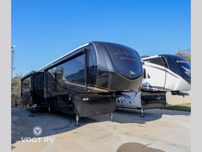 Enjoy opulent flourishes in the bedroom of the Pinnacle luxury fifth wheel, including a full entertainment center with faux fireplace (36SSWS only) and LED TV, as well as a cushioned seating area.