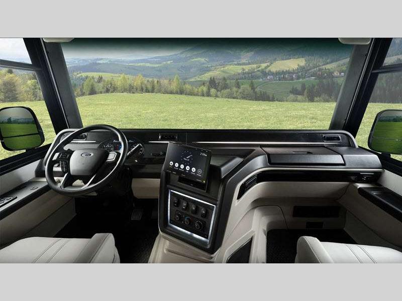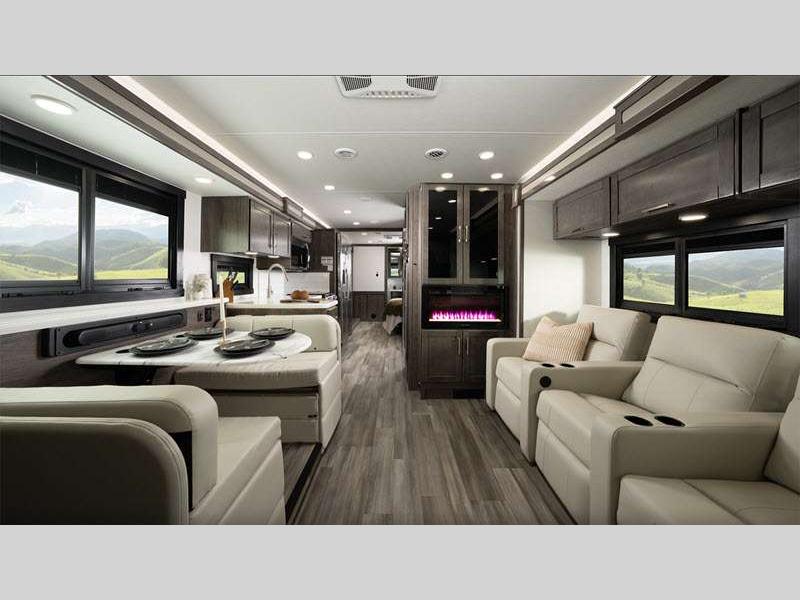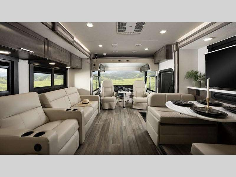 Sleeps 5 Slides 2 Length 36 ft 11 in Ext Width 8 ft 5 in Ext Height 12 ft 10 in Int Height 7 ft Interior Color Benton, Modern Farmhouse Exterior Color Standard Graphics. Full-Body Paint; Blackbird, Cardinal, Bluebird Hitch Weight 5000 lbs GVWR 22000 lbs Fresh Water Capacity 72 gals Grey Water Capacity 40 gals Black Water Capacity 40 gals Tire Size 235/80R22.5G Furnace BTU 30000 btu Generator 5,500-Watt Fuel Type Gasoline Engine 7.3L V8 Chassis Ford F53 Horsepower 335 hp Fuel Capacity 80 gals Available Beds King Torque 468 ft-lb Refrigerator Type Residential Cooktop Burners 3 Shower Size 30" x 36" Number of Awnings 1 LP Tank Capacity 16.5 gals Water Heater Type Suburban Tankless AC BTU 28500 btu Basement Storage 117 cu. ft. TV Info LR 39" LED HD Smart TV, BR LED HD Smart TV, Exterior LED HD Smart TV Awning Info 18' Electric with LED Lights Washer/Dryer Available Yes Gross Combined Weight 26000 lbs Shower Type Standard Electrical Service 50 amp Solar Wattage 200 watts Similar Floorplans