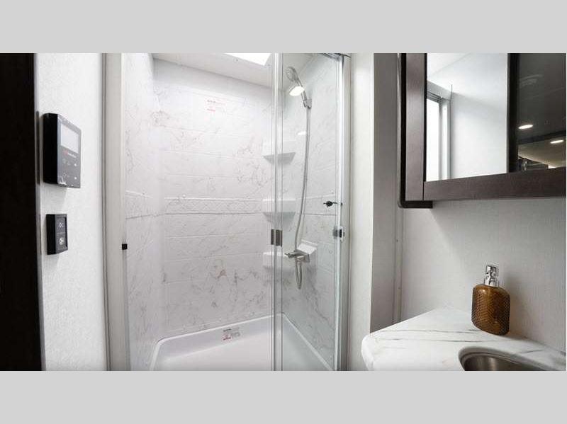 - Shower with decorative surround, glass door, skylight and light