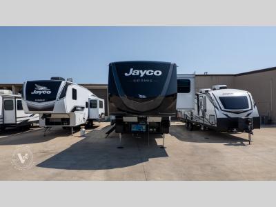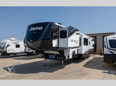 One look at the Seismic toy haulers by Jayco, and you'll never go back! Each model features a custom automotive-grade vinyl exterior graphics package, a painted fiberglass front cap with built-in LED lighting, and 102" wide-body structural steel I-beam construction. You'll find the pass-through storage with Slam-Latch baggage doors will make unpacking easier than ever, and the rear ramp door/patio with anti-slip, non-skid flooring will allow you to unload your toys with no trouble at all. These toy haulers feature a three seasons garage wall/doors, a 30 gallon fuel tank with a timer, and exterior marine-grade speakers to keep the party going. The Climate Shield zero degree tested weather protection includes a 35,000 BTU furnace, PEX plumbing, and a fully enclosed and heated underbelly so you can enjoy your adventures year around. And we haven't even touched on the interior luxuries you'll find, like solid hardwood cabinet doors, residential vinyl flooring made in the USA, night shades, and more!