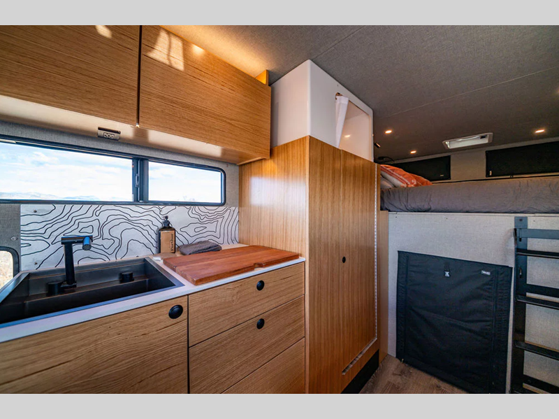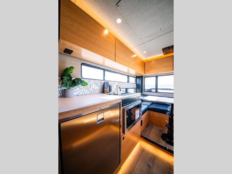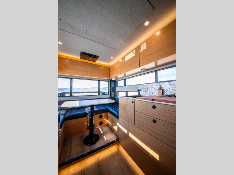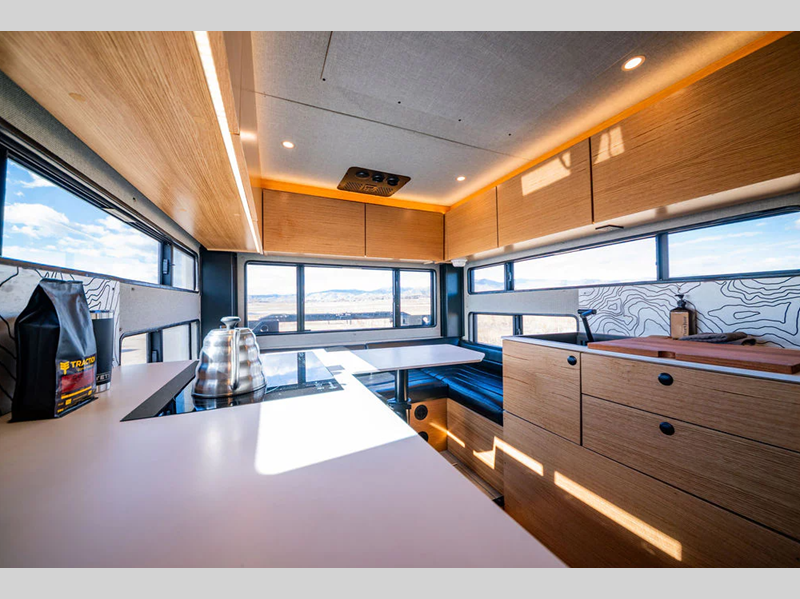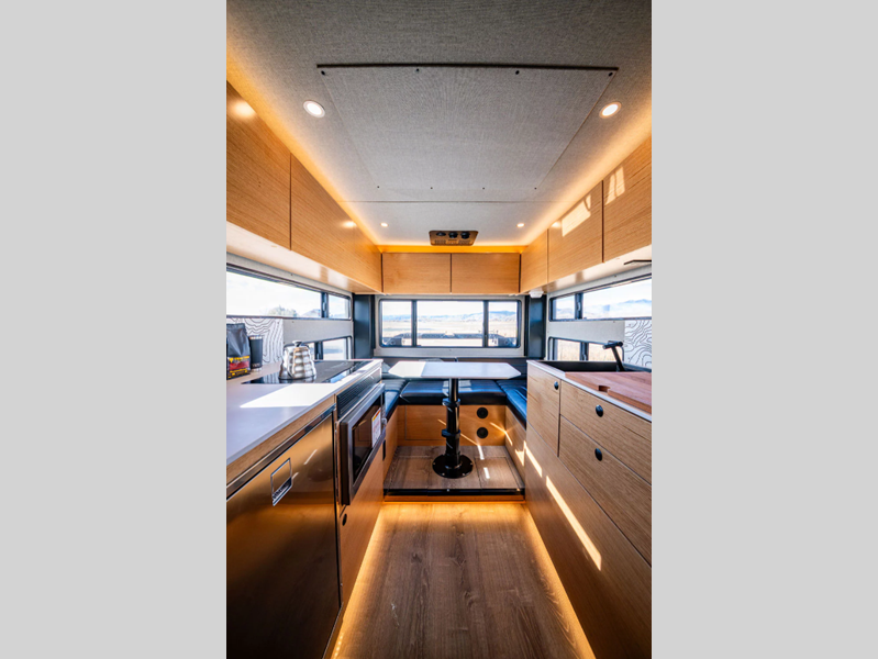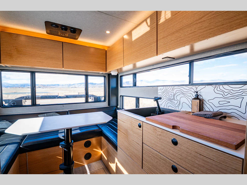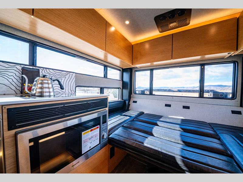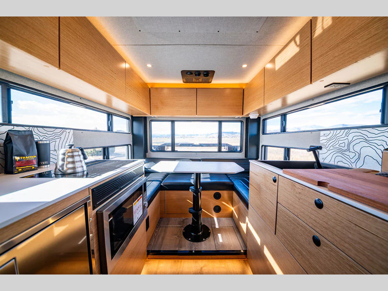 Each model is constructed with premium Corian countertops and light gray walls and ceiling adding a luxury touch to each piece. Whether you're tackling tougher back roads, listening to your favorite tunes, or planning your day with your co-pilot, the insulated pass-through will help keep the cab quiet while you travel. The Baja Plus sits on the durable Ram 5500 chassis, with the option to choose the Ford F-550 chassis.