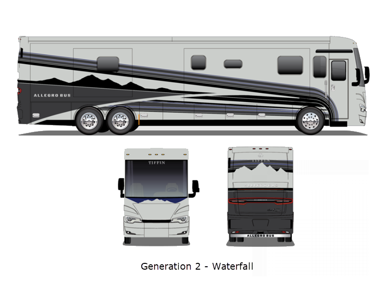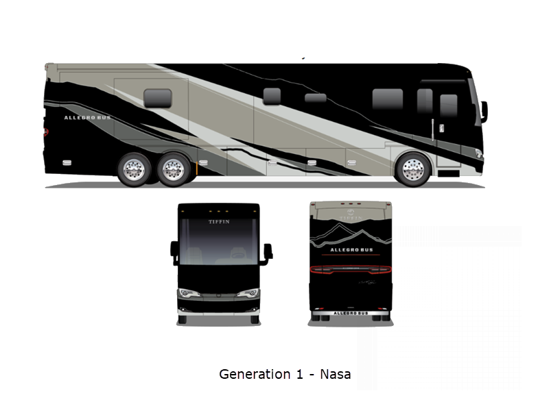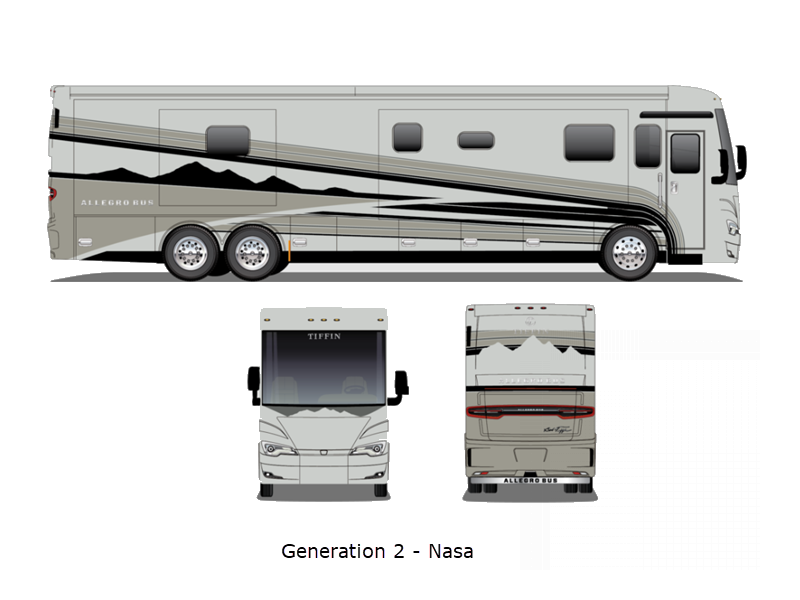 Sleeps 6 Slides 4 Length 45 ft Ext Width 8 ft 5 in Ext Height 13 ft 3 in Int Height 6 ft 11 in Interior Color Great Smoky Moutains Exterior Color Generation 1, Generation 1; Nasa, Cinderwood, Waterfall Hitch Weight 15000 lbs GVWR 52000 lbs Fresh Water Capacity 100 gals Grey Water Capacity 100 gals Black Water Capacity 55 gals Tire Size 315/80R 22.5 Generator 10.0 kW Onan Quiet Fuel Type Diesel Engine Cummins L9 Chassis PowerGlide XC Raised Rail Rear Horsepower 450 hp Fuel Capacity 150 gals Wheelbase 323 in Available Beds Power Smart King Torque 1250 ft-lb Refrigerator Type Stainless Steel Residential with French Doors and Bottom Freezer Refrigerator Size 25 cu ft Convection Cooking Yes Cooktop Burners 2 Shower Size 32" x 48" Number of Awnings 2 Axle Weight Front 18000 lbs Axle Weight Rear 23000 lbs Axle Weight Tag 14000 lbs Water Heater Type Aqua Hot 450D AC BTU 45000 btu Basement Storage 257 cu. ft. TV Info LR Lift TV, BR 50" TV, Ext. TV Awning Info Girard Roof Mounted Powered with Integrated LED Lighting and Dual Pitch Feature Washer/Dryer Available Yes Gross Combined Weight 67000 lbs Shower Type Standard Electrical Service 50 amp Similar Floorplans
