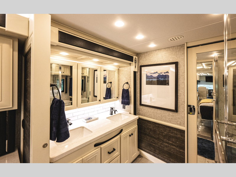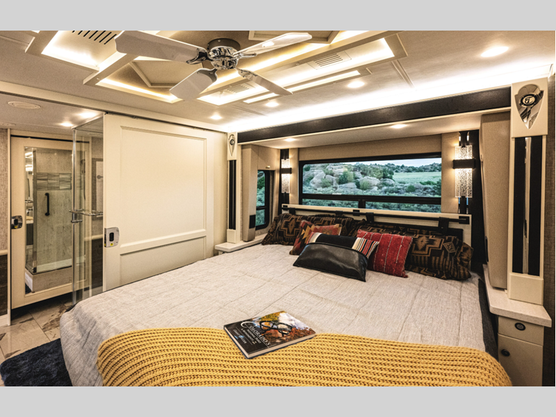 You will love the exterior paint scenes that portrays the Rocky Mountains and the slide facia that is similar to the grill of a Packard, which is Bob's favorite car. The Cummins L9 450 HP diesel engine will power your trips across the states and the PowerGlide XC raised rail rear chassis provides a strong foundation and smooth ride. There is 257 cu. ft. of storage capacity so nothing gets left behind, and you are sure to appreciate the 10.0 kW Onan quiet diesel generator.